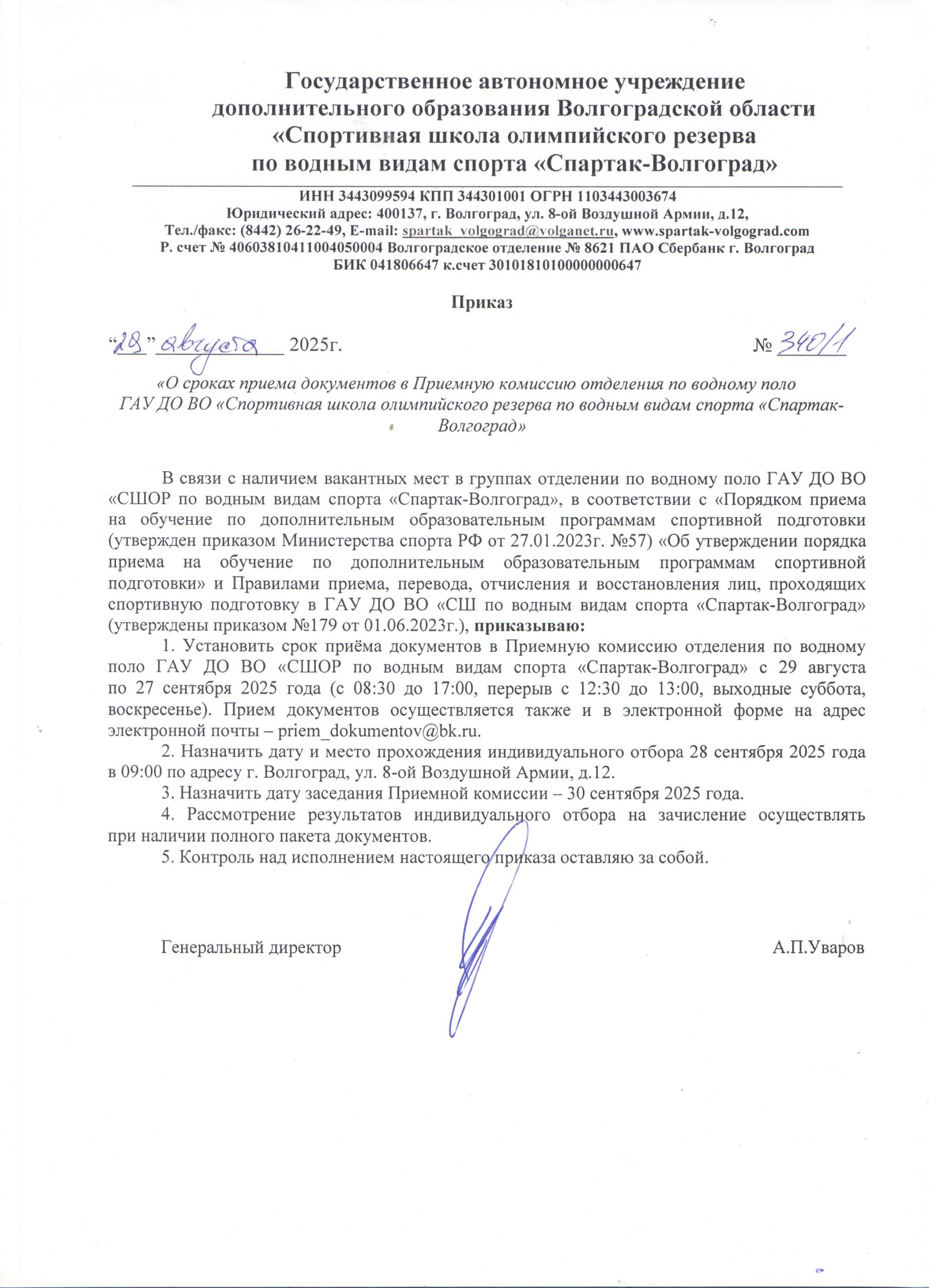 Перечень документов на поступления в отделение по водному поло (документы высылать на e-mail: priem_dokumentov@bk.ru):